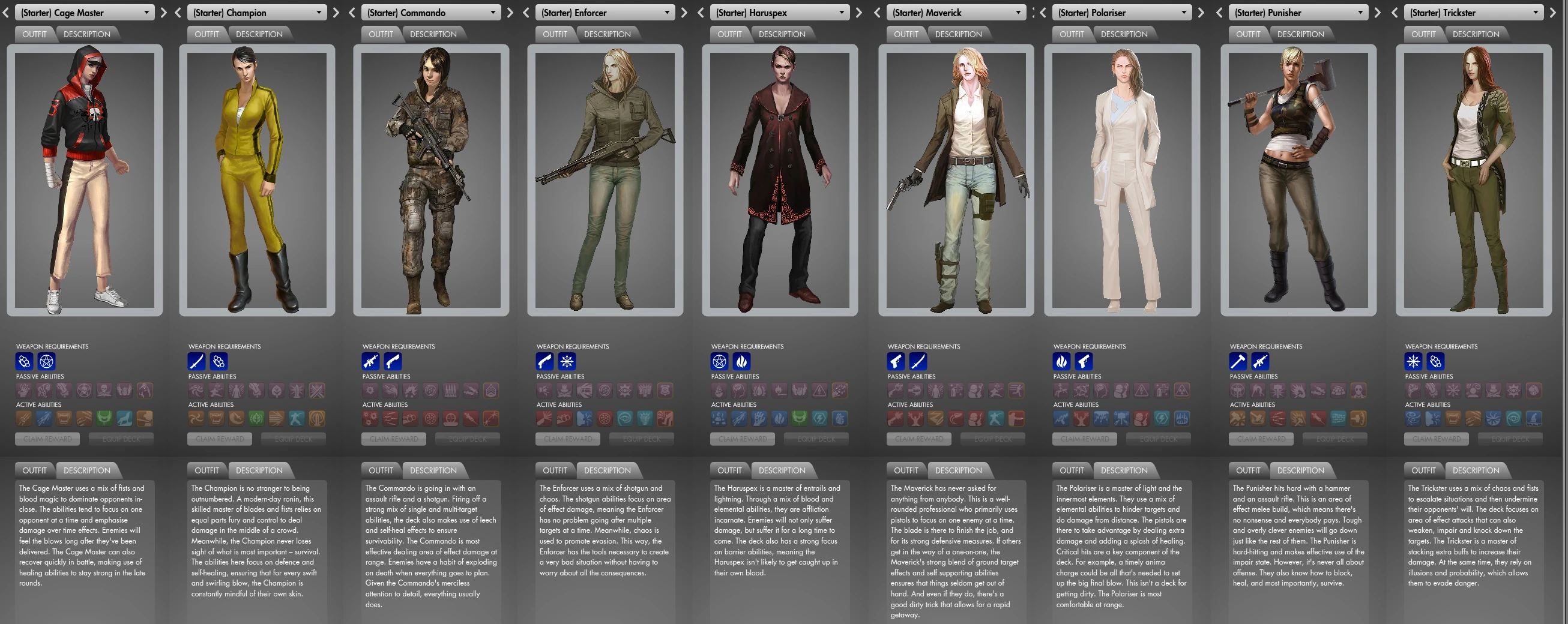 Pre-built or Pre-constructed Decks are templates of Abilities and the weapons that enable them, designed to lead new players into the game's mechanics. The names for them show a great deal of effort in imagining the nuances of the game setting, and are quite "flavorful"; decks are for more than roleplaying purposes, however; they affect game mechanics with their choice of Abilities. There are eleven unique decks for each faction, representing the various specialisations they have taken up to combat darkness—and each other.